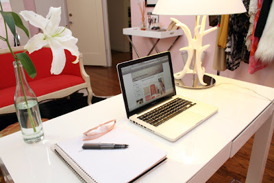 The recoccurring theme for me seems to be light, feminine colors, and a simple desk arrangement with accent pieces to keep the area fun!